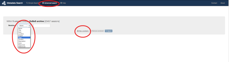 Advanced Search: In Advanced Search, the structure of the metadata file (session) is the basis for the search. In the figure below you can see some options of Advanced Search: it shows one main dropdown selection and one text input field. Depending on the session subfiled you choose you could have different input fields to fill and other dropdown lists. This search is on session name only; any text you enter into the free-text field will only search the session name field of your selected section of the corpus. You can also narrow down your search by adding new constraints and search for more than one criterium at the same time (and criterium stacking).