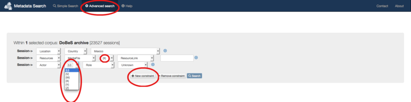 The above example of a more complex search shows a three constraints search (constraints are like filters that you apply to your search. The buton "New Constraint" allows you to add constrainsts to your search): the first constraint searching on Session --> Location --> Country --> Mexico, the second on Session --> Resources --> MediaFile "(X)"--> Resource Link= "*", and the third on Session --> Actor "U" --> Role --> Unknown.