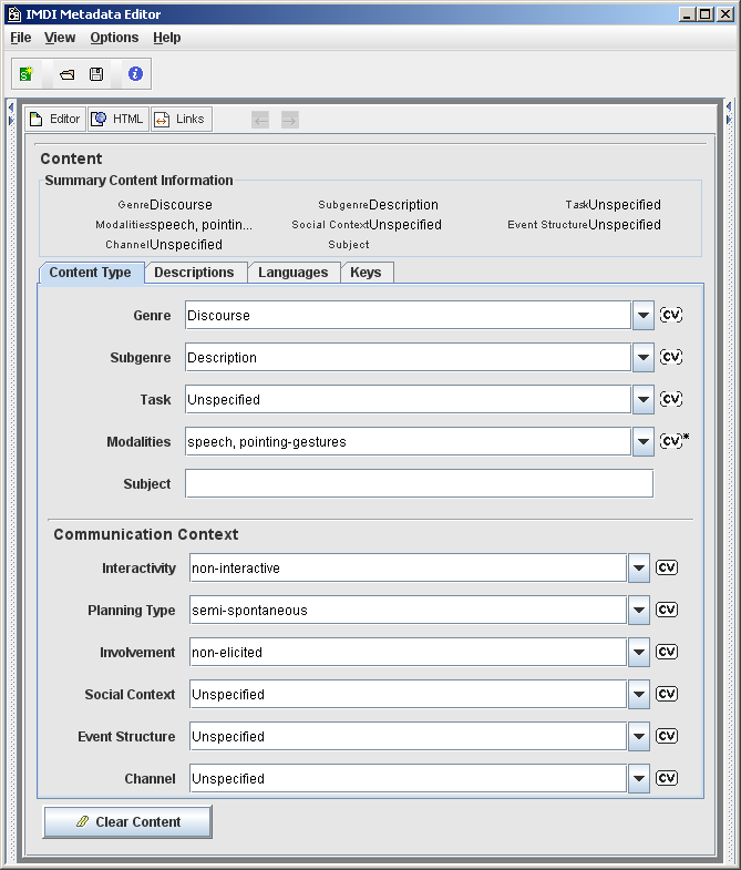 Many of the fields under Content Type offer predefined values that are displayed in the form of pull-down menus[3]: some of them only accept values from the pull-down menu, while others allow you to enter alternative values (see below). Furthermore, it is sometimes possible to enter more than one value – in this case, please separate the values with a comma. See Section 1.5.2 for the different options and how they are symbolized in the IMDI Editor.