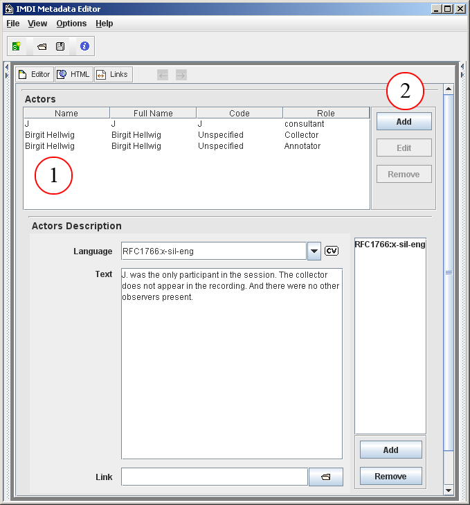 Each actor involved in the session has to be listed on the Actors screen. If an actor occurs in two different Roles (e.g., once as collector and once as annotator) (s)he has to be listed twice. To add an actor (see also Section 1.3), do the following: