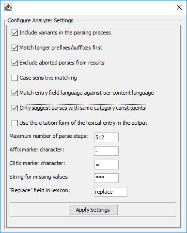 The names are somewhat misleading; all of the Parse, Gloss and Lexicon analyzers require access to a lexicon. The Parse analyzer morphologically parses annotations from a word (or token) level tier, based on lexical units (prefixes, stems, suffixes etc.) available in the lexicon (internally the parser is implemented as a state machine with a stack). The results are shown as parse suggestions in a suggestion window from which the user can select one. This analyzer requires one source tier and one target tier, where the target is of a subdivision tier type.