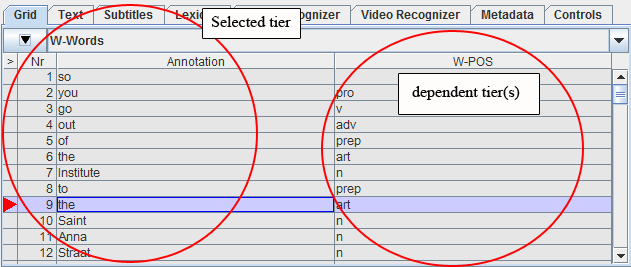 The Grid Viewer displays the content as well as the begin time, end time and duration of all annotations from a single tier. You have to activate this Viewer through selecting the tab next to the video window.