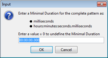 The buttons and enables you to constrict the minimal and maximal duration of each result. When you click on one of the buttons, a dialog window appears, e.g.: