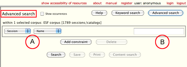 | AdvancedSearch: | In Advanced Search, the structure of the metadata file is the basis for the search. Figure 2.5 shows the most basic option of Advanced Search: it shows two dropdown selections (A) and a free-text field (B). This search is on session name only; any text you enter into the free-text field will only search the session name field of your selected section of the corpus. |