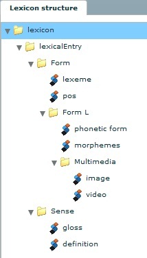 In LEXUS you may add three types of multimedia: images, sound files and video files. It is wise to create a separate data category for the multimedia in the lexicon structure. An example of this is given in Figure 2.20, where a Multimedia container (under LexicalEntry > Form > Multi Media) with two data categories: Image and Video, is located under Form. How to add data categories and components to your structure is explained in Section 2.2.