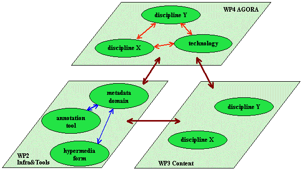 Technology issues are one of the four main pillars of ECHO. Technology is dealt with at various layers: (1) It is natural part of the AGORA discussions, in particular between specialists from the humanities disciplines and technology; (2) It is part of the content provision work in so far that the content providers use tools and have to integrate their resources into a browsable and searchable domain; (3) It is subject of the Infrastructure and Tools work package. The following diagram describes the interaction between these ECHO layers.