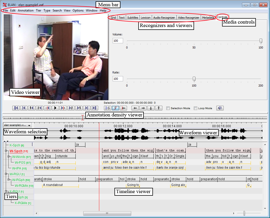 This section introduces the setup of the Viewers, the Menu bar, the Media Player options and the color coding. Detailed information about how to navigate through the ELAN window follows in the subsequent sections.