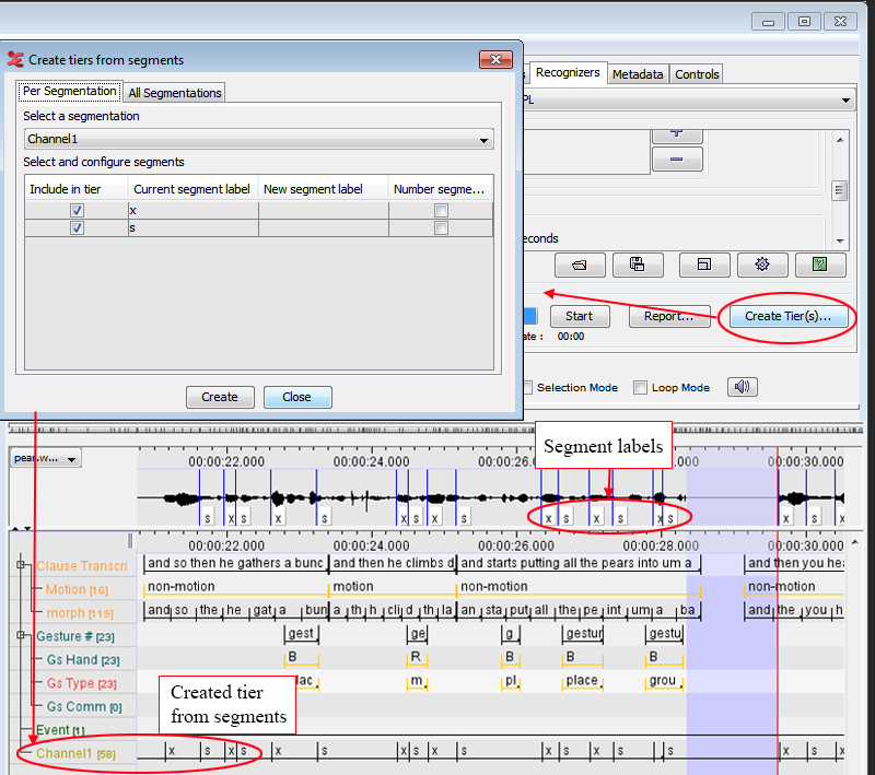 If all segment labels are to be used, open the All Segmentations tab instead of the Per Segmentation tab. On the All Segmentations tab you are only asked to select the channels for which a tier must be created. Again, clicking the button will make ELAN create the tier.