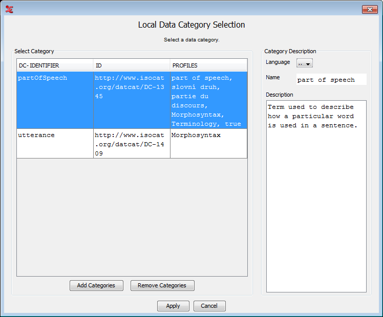 The original purpose of this system is to associate (parts of) your data to a common labelling system to improve interoperability between resources and tools. To do so, select a data category and click on . This will associate the selected data category to an annotation, entry of a controlled vocabulary or tier type, depending on the point from which you entered the Local Data Category Selection.