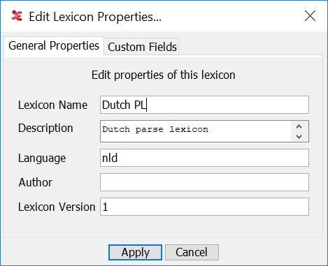 The option opens a window similar to the Create New Lexicon dialog, the properties that have been entered before can be updated or completed here. But there are two additional tabs, and , described below. Click the button to apply the changes to the lexicon.