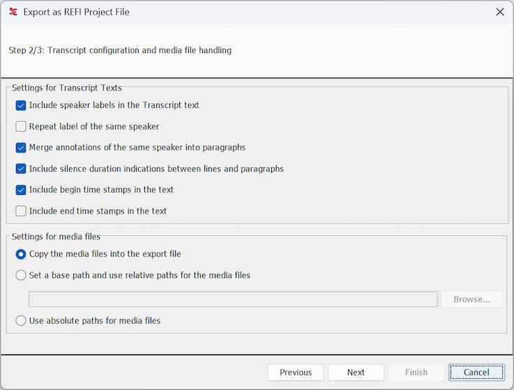 Include begin (and/or end) time stamps in the text: if selected, a formatted time stamp will be printed at the beginning (or end) of a line or paragraph. Importing QDA applications may or may not show these time stamps in their text view.