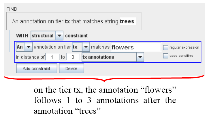 For example: annotations contained in a structural distance of –1 to 2 tx-annotations from trees on the tier tx are sees, trees, and, flowers.